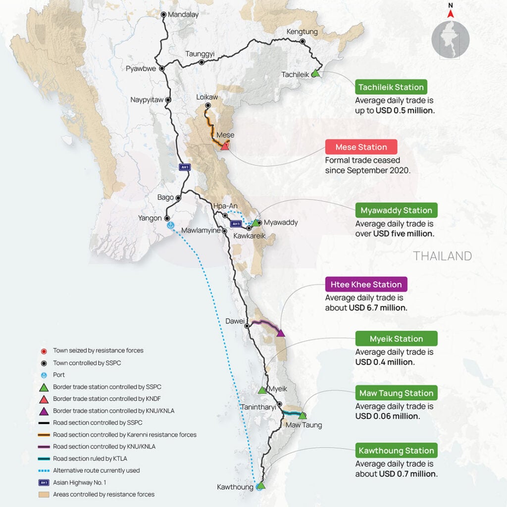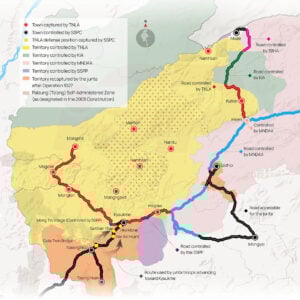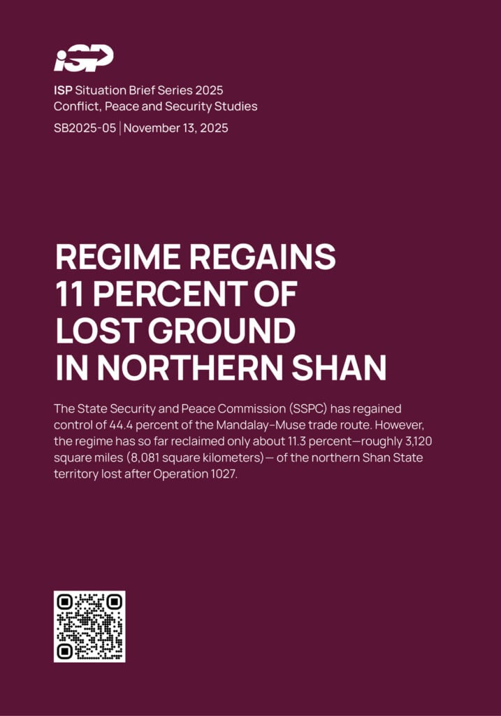 The State Security and Peace Commission (SSPC) has regained control of 44.4 percent of the Mandalay–Muse trade route. However, the regime has so far reclaimed only about 11.3 percent—roughly 3,120 square miles (8,081 square kilometers)— of the northern Shan State territory lost after Operation 1027.