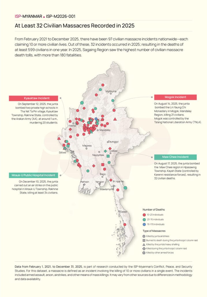 From February 2021 to December 2025, there have been 97 civilian massacre incidents nationwide—each claiming 10 or more civilian lives. Out of these, 32 incidents occurred in 2025; resulting in the deaths of at least 599 civilians in one year. In 2025, Sagaing Region saw the highest number of civilian massacre death tolls, with more than 180 fatalities.