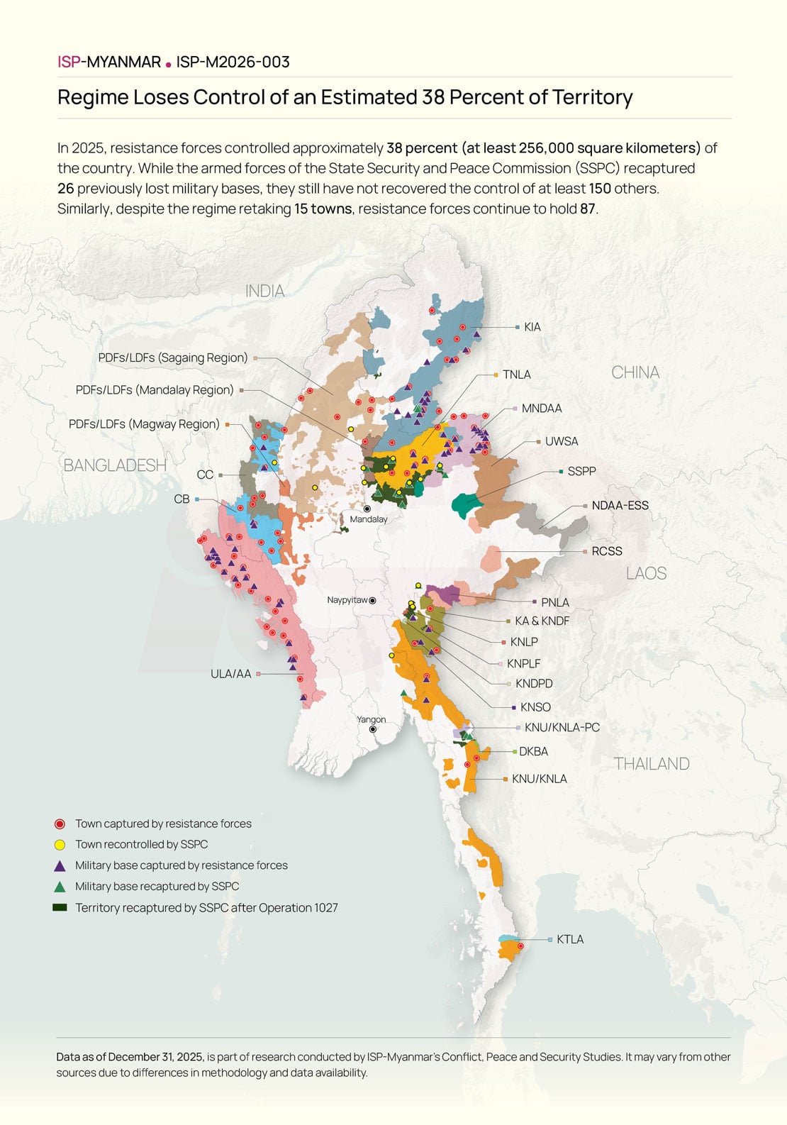 In 2025, resistance forces controlled approximately 38 percent (at least 256,000 square kilometers) of the country. While the armed forces of the State Security and Peace Commission (SSPC) recaptured 26 previously lost military bases, they still have not recovered the control of at least 150 others. Similarly, despite the regime retaking 15 towns, resistance forces continue to hold 87.