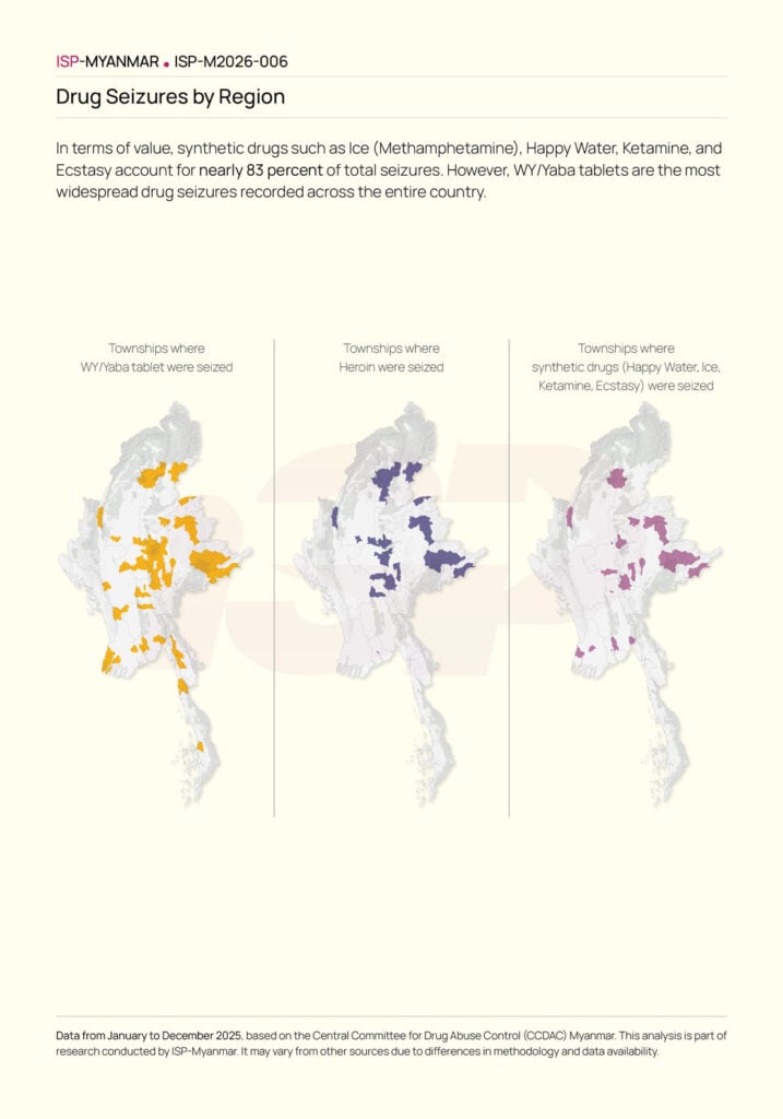 In terms of value, synthetic drugs such as Ice (Methamphetamine), Happy Water, Ketamine, and Ecstasy account for nearly 83 percent of total seizures. However, WY/Yaba tablets are the most widespread drug seizures recorded across the entire country.