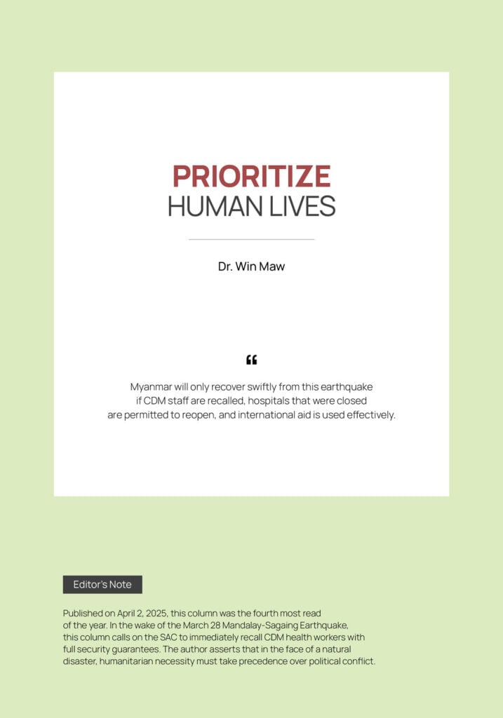 Published on April 2, 2025, this column was the fourth most read of the year. In the wake of the March 28 Mandalay-Sagaing Earthquake, this column calls on the SAC to immediately recall CDM health workers with full security guarantees. The author asserts that in the face of a natural disaster, humanitarian necessity must take precedence over political conflict.