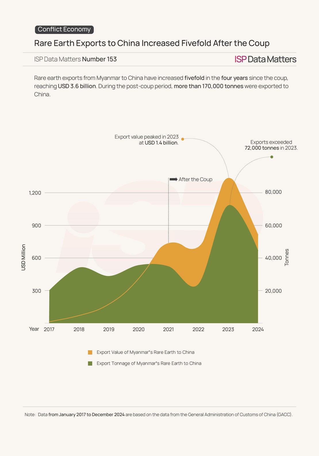 Rare earths generally include around 17 types of minerals. Our studies show critical minerals, are extracted in Kachin: Dysprosium (Dy) and Terbium (Tb). These elements are crucial for high-tech products worldwide, including EVs, defense, military equipment, and green energy technologies. According to our data, Myanmar’s rare earth exports to China exceeded USD 3.6 billion in the past four years. That’s over five times higher than the same period before the coup.