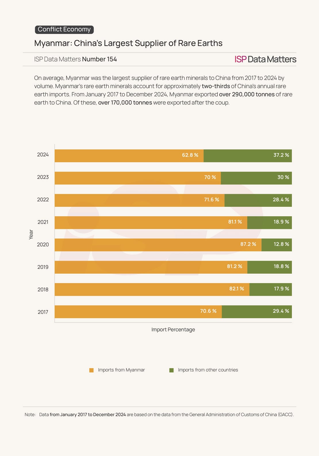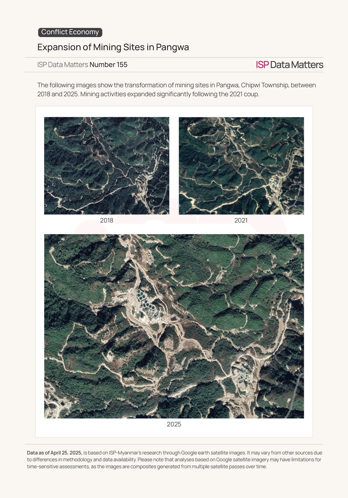 Research findings by ISP-Myanmar identified more than 370 rare earth mining sites and 2,700 in situ leaching collection ponds in Kachin State’s Chipwi and Momauk townships, the epicenter of Myanmar’s rare earth extraction. Over 240 of these sites (66 percent) were developed after the 2021 military coup. The total area of operations now exceeds the size of Singapore. Myanmar has exported over 290,000 tonnes of rare earths to China in total, with nearly 170,000 tonnes shipped in the years following the coup.