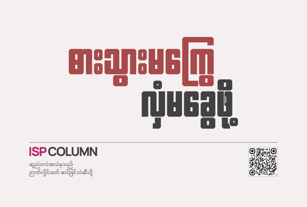 ISP Column ဆောင်းပါးတွေကို တောက်လျှောက်ဖတ်လာခဲ့တာမှာ ထင်ပေါ်လာလို့ သတိထားမိတဲ့အကြောင်းအရာတခု ရှိလာတယ််။ ဒါကတော့ တော်လှန်ရေးရဲ့ အမည်းကွက်ပါ။ ကျနော်ကိုယ်တိုင်ကတော့ တော်လှန်ရေးနယ်မြေထဲမှာ ရှိနေတာမဟုတ်ပေမဲ့ တော်လှန်ရေးနယ်မြေထဲကနေ ပဲ့တင်လာထပ်တဲ့ အသံတွေကို နားထောင်ရမိတာကဖြင့် စိတ်အားလျော့ဖို့ကောင်းပါတယ်။