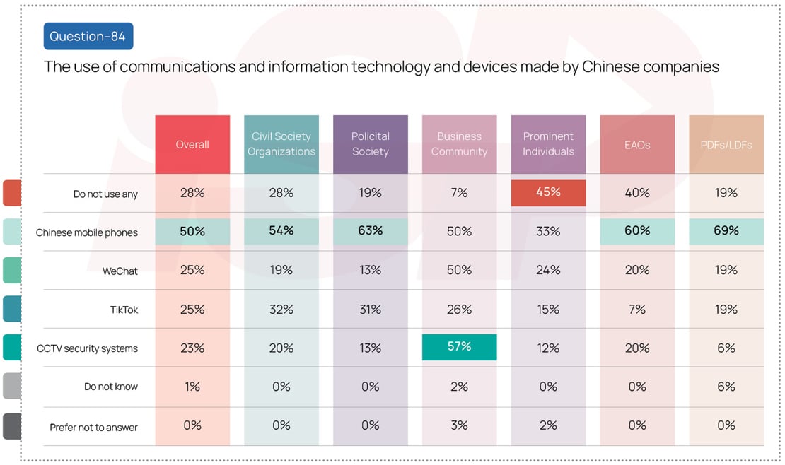 For survey question No. 84, respondents were asked whether they use communications and information technology and devices made by Chinese companies from a given list, with the option to select more than one if applicable.