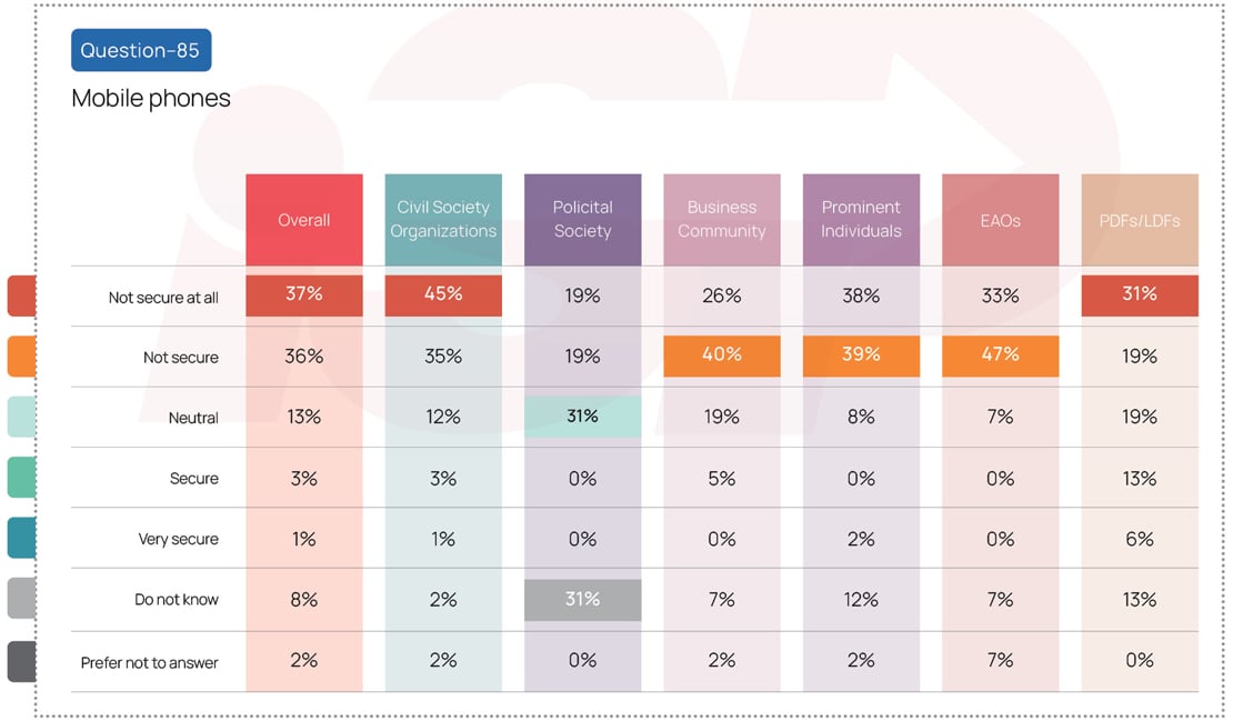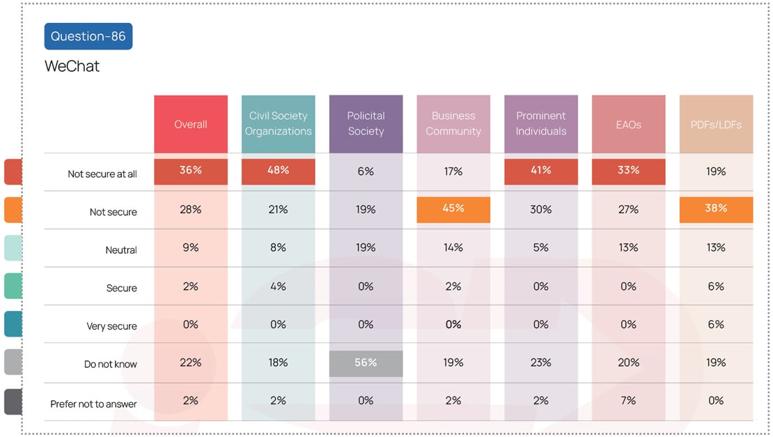 The survey reveals that among the six respondent communities, CSOs and EAOs expressed the highest share of concerns about the security of mobile phones made by Chinese companies, with 80 percent rating them as not secure. Prominent individuals and CSOs showed the highest share of concern regarding Chinese made CCTV systems, 78 percent believed they were not secure, and 71 percent thought WeChat was insecure. More than three-fourths (76 percent) of CSOs rated TikTok as not secure.
