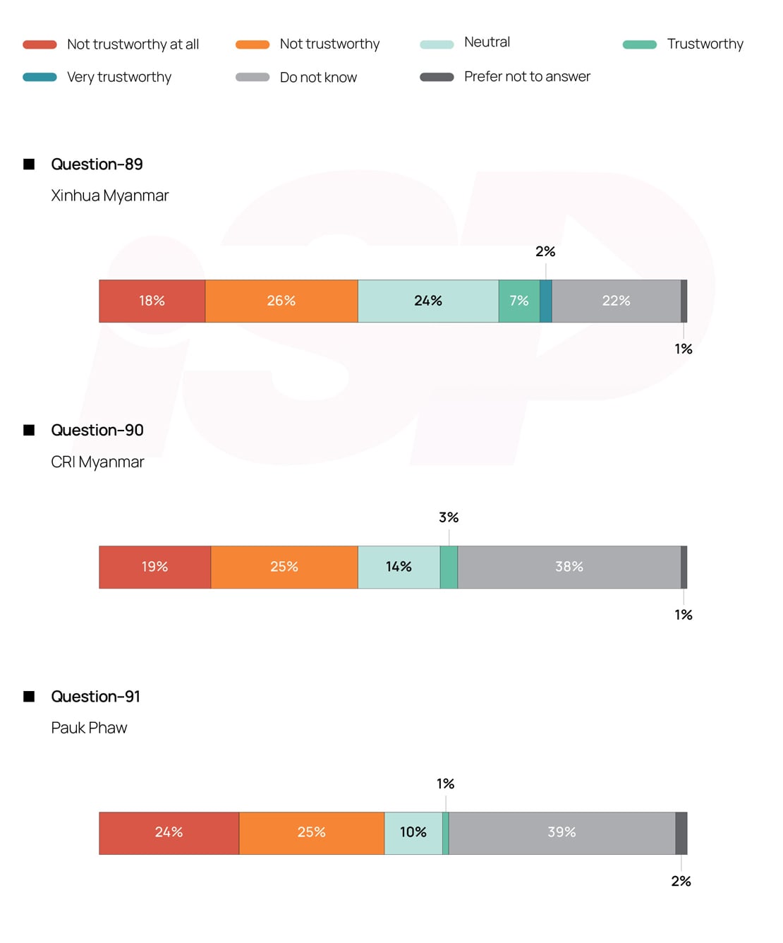 For survey questions No. 89 to 91, respondents were asked about their perceived level of trust in Chinese state-owned media outlets broadcasting in the Burmese language. These questions were newly added in this round of survey.