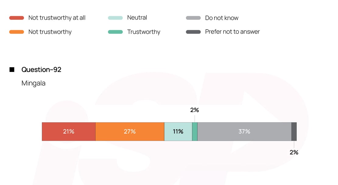 For Xinhua Myanmar, 44 percent responded, “not trustworthy,” and 22 percent responded do not know. For CRI Myanmar, 44 percent answered “not trustworthy at all,” and 38 percent did not know. For ‘Pauk Phaw,’ 49 percent expressed a lack of trust, and 39 percent did not know. For Mingala, 48 percent believed it was not trustworthy, and 37 percent did not know.