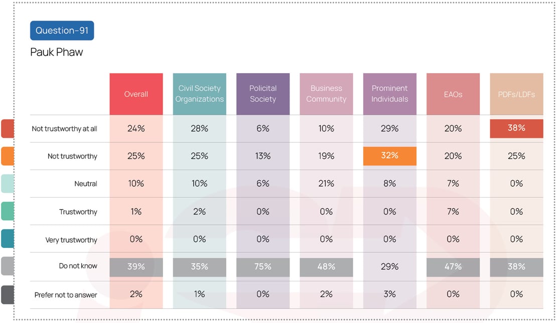 The survey shows limited awareness and widespread distrust of Chinese state-owned media in Burmese language among Myanmar’s key stakeholder groups. Forty-four percent of the political society group reported being unaware of Xinhua Myanmar, while 56 percent of prominent individuals deemed it untrustworthy. Awareness of CRI Myanmar was also low: 75 percent of the political society group, 50 percent of the business community, 41 percent of CSO respondents, and 40 percent of EAOs said they were unfamiliar with it. Similarly, Pauk Phaw was poorly received, with 63 percent of PDFs/LDFs expressing distrust.