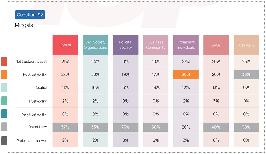 For survey question No. 92, respondents were asked about their perceived level of trust in Chinese state-owned media outlets broadcasting in the Burmese language. These questions were newly added in this round of survey.