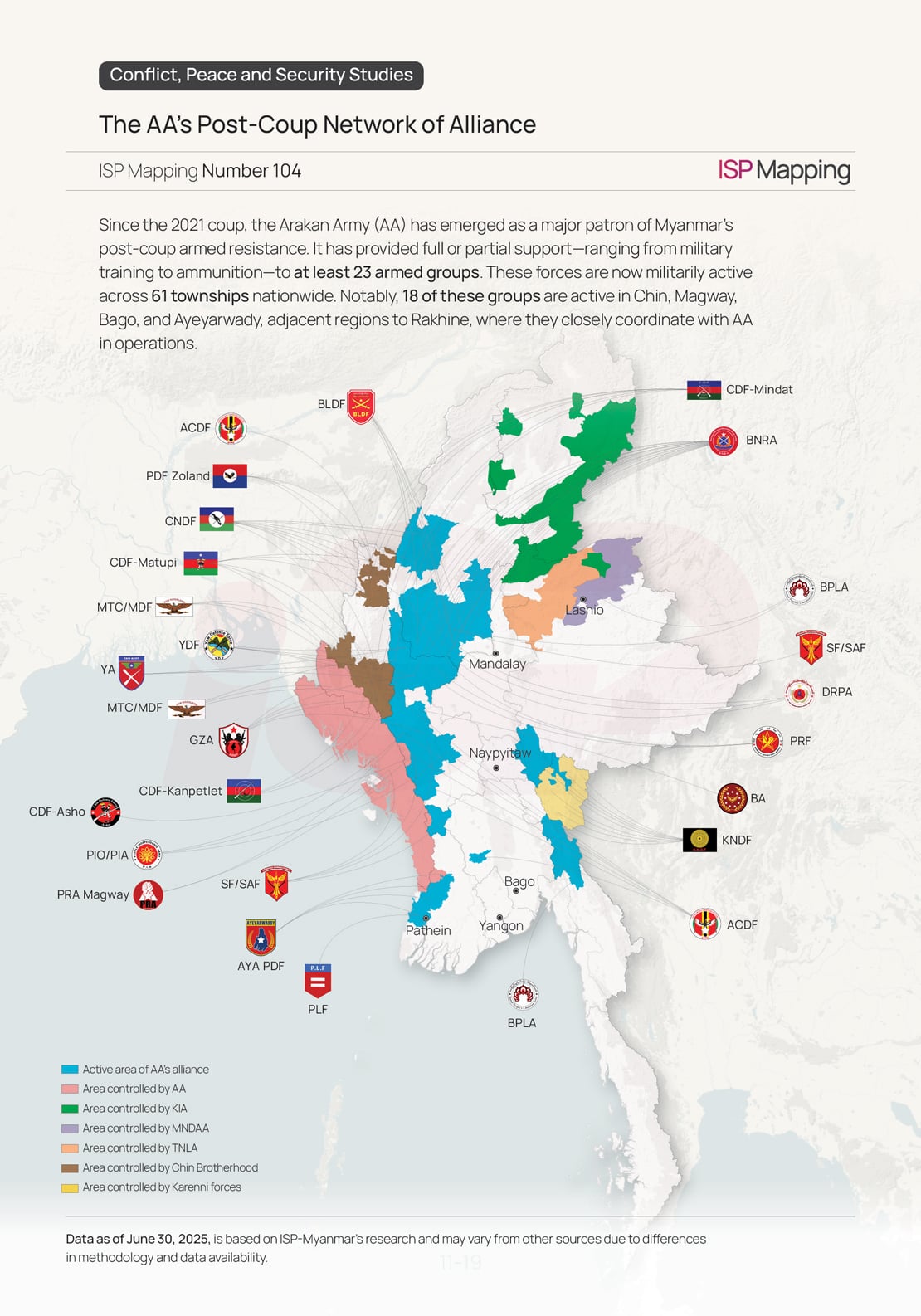 Since the 2021 coup, the Arakan Army (AA) has emerged as a major patron of Myanmar’s post-coup armed resistance. It has provided full or partial support—ranging from military training to ammunition—to at least 23 armed groups. These forces are now militarily active across 61 townships nationwide. Notably, 18 of these groups are active in Chin, Magway, Bago, and Ayeyarwady, adjacent regions to Rakhine, where they closely coordinate with AA in operations.