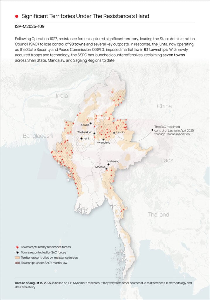 Following Operation 1027, resistance forces captured significant territory, leading the State Administration Council (SAC) to lose control of 98 towns and several key outposts. In response, the junta, now operating as the State Security and Peace Commission (SSPC), imposed martial law in 63 townships. With newly acquired troops and technology, the SSPC has launched counteroffensives, reclaiming seven towns across Shan State, Mandalay, and Sagaing Regions to date.