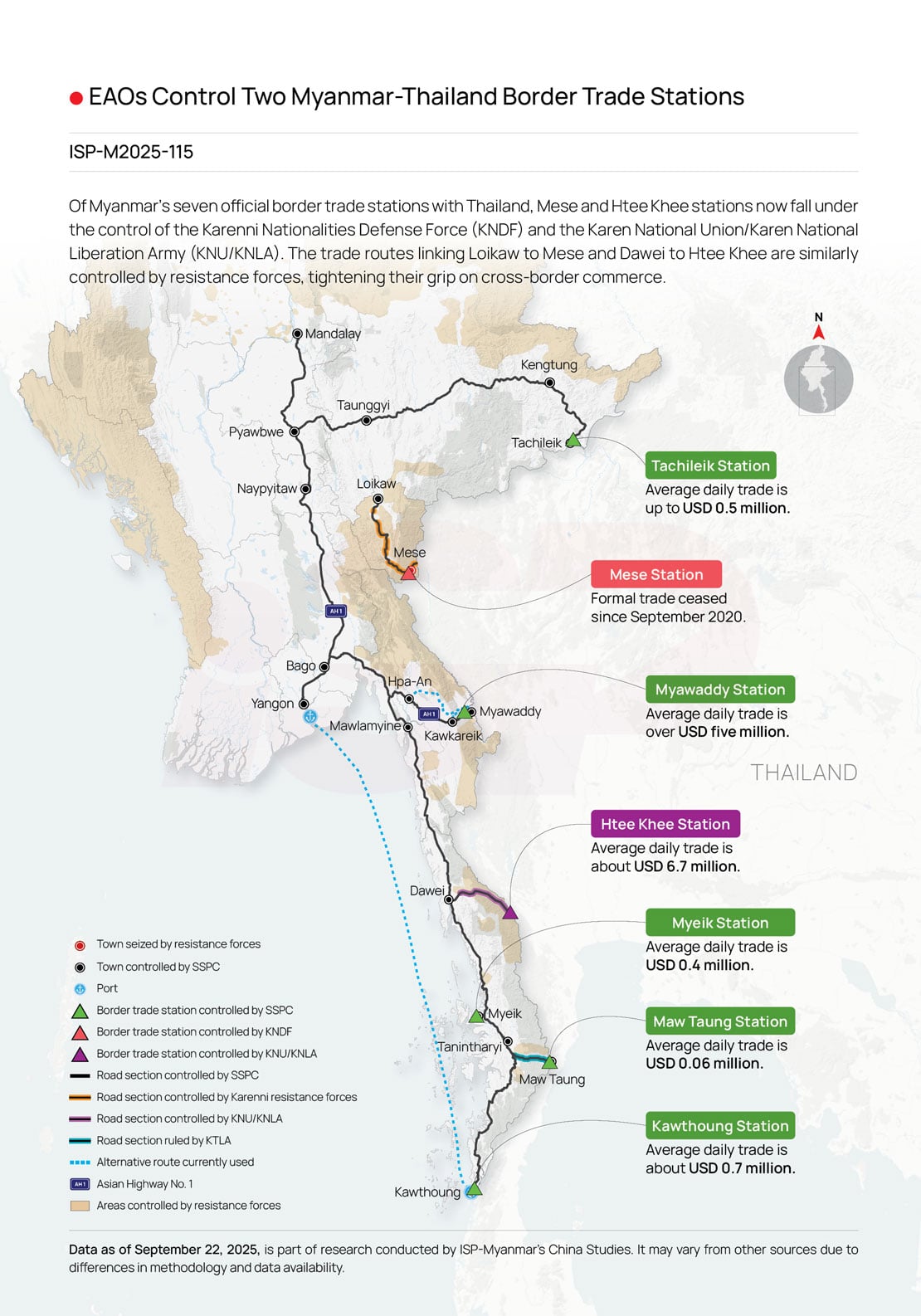 Of Myanmar’s seven official border trade stations with Thailand, Mese and Htee Khee stations now fall under the control of the Karenni Nationalities Defense Force (KNDF) and the Karen National Union/Karen National Liberation Army (KNU/KNLA). The trade routes linking Loikaw to Mese and Dawei to Htee Khee are similarly controlled by resistance forces, tightening their grip on cross-border commerce.