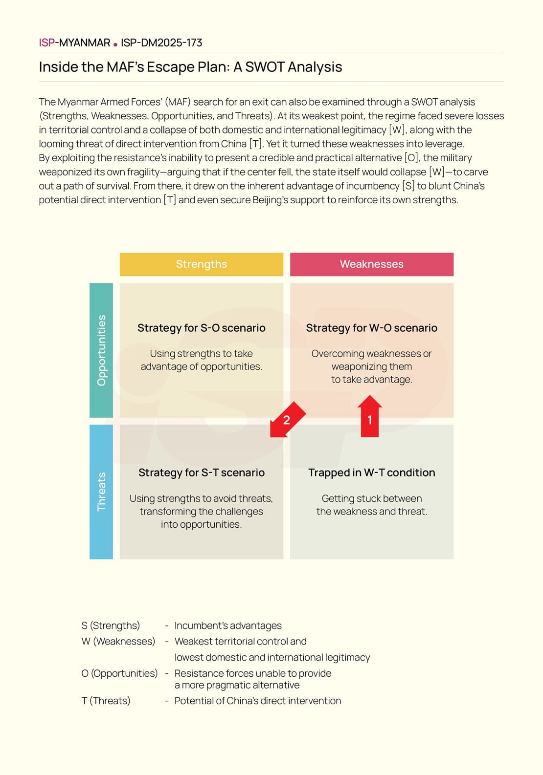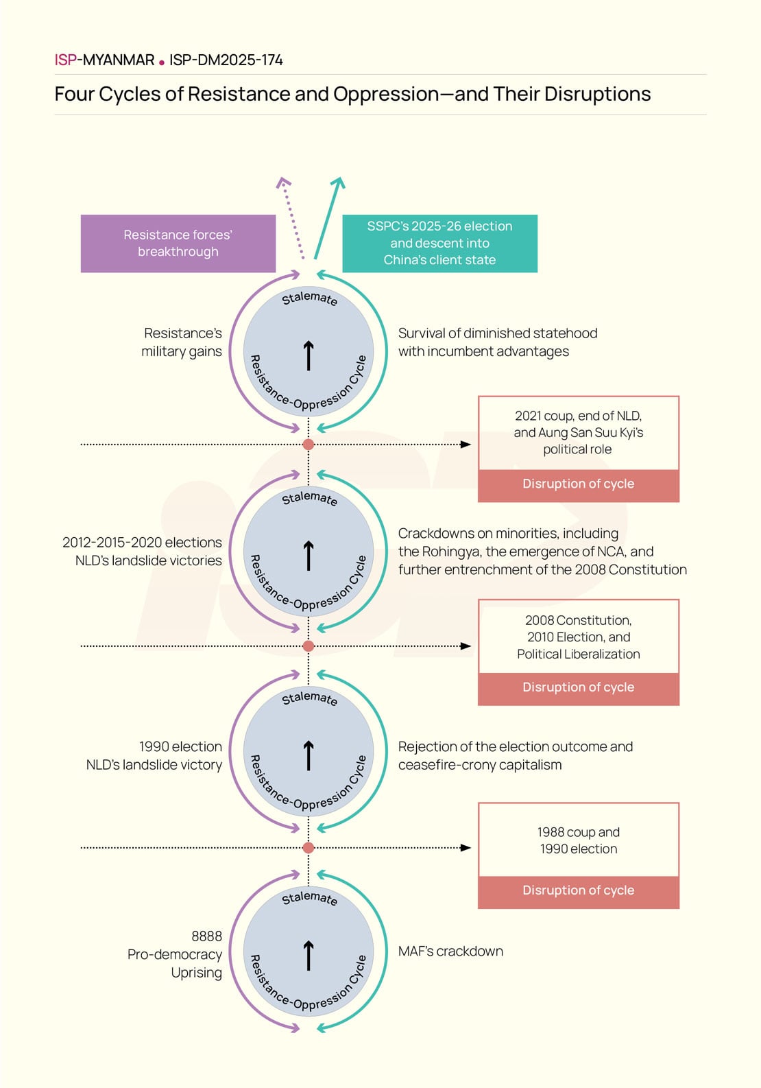 ( a ) The regime will retain the upper hand in managing the conflict. Myanmar’s resistance or conflict does not move in a linear manner; it unfolds in cycles shaped by generational change, shifting political landscapes, technological advances, and evolving geopolitics. Since 1988, whenever the struggle between resistance and repression has reached a stalemate, it has been the regime that has ultimately broken the deadlock and created an exit on its own terms. In the current post-2021 stalemate, the regime is again trying to rupture the cycle, this time by leveraging the 2025–26 elections and Beijing’s support as its main exit strategy [see ISP Data Matters (ISP-DM2025-174)].