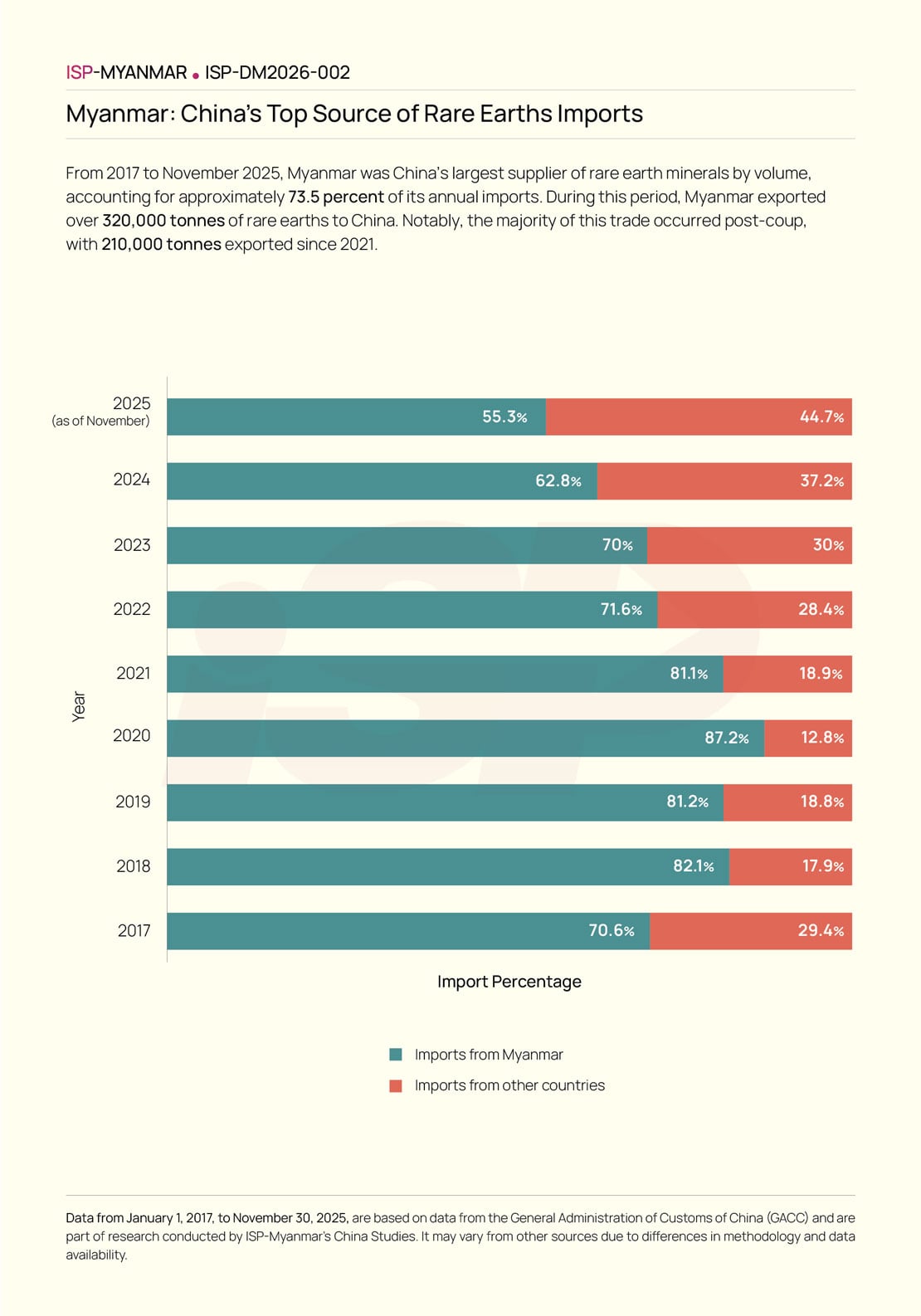 Beyond Myanmar’s borders, rare earth mining plays a significant role in the country’s informal conflict economy in the absence of state-control. Myanmar is among the world’s leading producers of heavy rare earth elements (HREE). Since 2017, it has exported approximately USD 4.9 billion worth of rare earths to China, with 86 percent of these exports (about USD 4.2 billion) occurring in the post-coup period. From 2019 to 2024, Myanmar accounted for more than half of China’s rare earth imports [see ISP Data Matters 2/2026 (ISP-DM2026–002)].