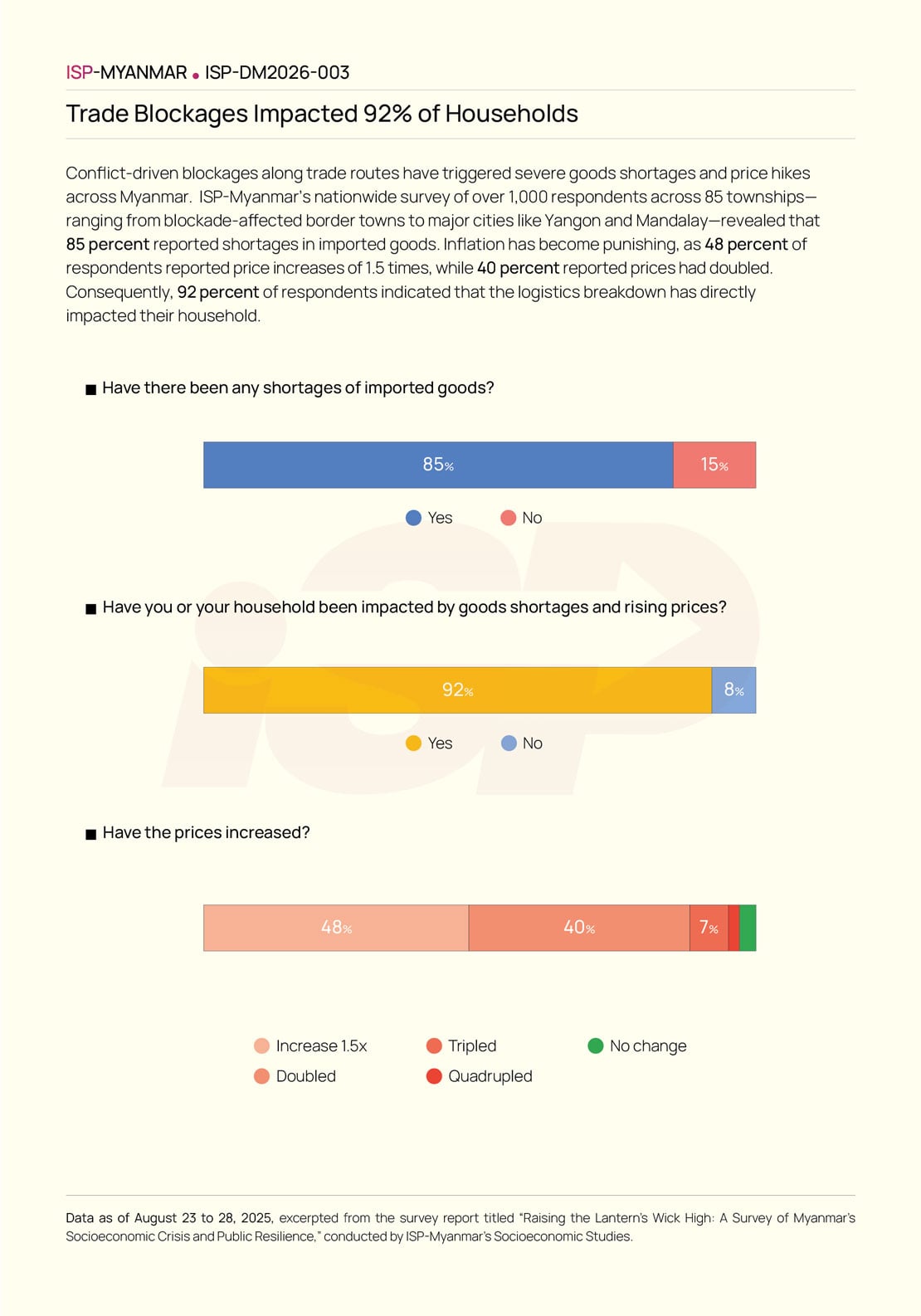 On top of this, China’s “Five Cuts” strategy—severing water, electricity, internet, logistic supplies, and manpower to pressure EAOs in northeastern Myanmar—has sharply disrupted trade and cut the flow of goods. For victims of the Sagaing–Mandalay earthquake, already struggling to recover, these shocks amounted to a second blow. ISP-Myanmar’s survey shows the most acute shortages are in consumer goods and basic foodstuffs, while the lack of medicines remains the chief source of public anxiety. Overall, 85 percent of over 1,000 respondents reported shortages of imported goods due to blocked trade routes, and 92 percent of households reported being directly affected [see ISP Data Matters (ISP-DM2026-003)].