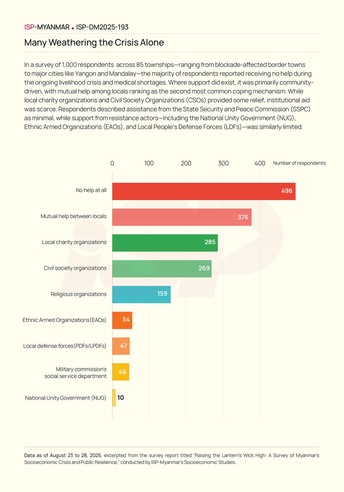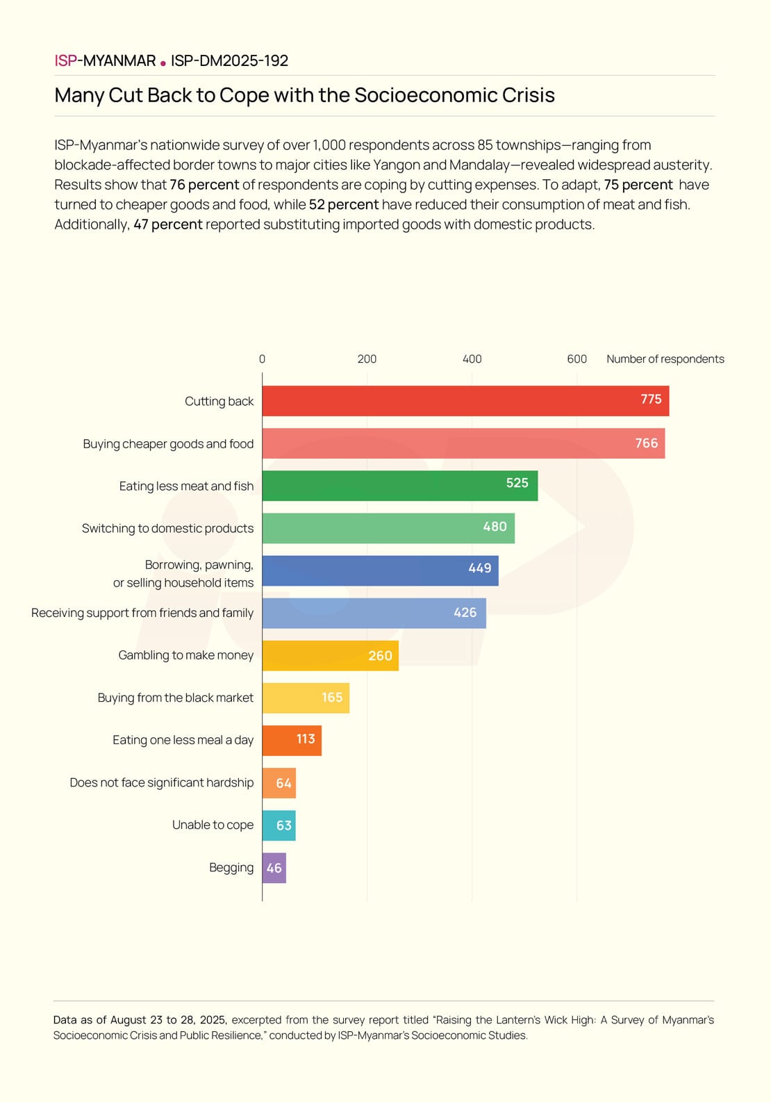 Survey responses indicated that most people felt there was no one to turn to for support and were forced to rely on mutual help among the communities to get by. Some reported assistance from local charity networks, CSOs, and religious groups, while a smaller share cited help from actors such as EAOs, PDFs, and LPDFs. Those receiving support from the regime or the National Unity Government (NUG) were the fewest of all. As a result, households have been compelled to cut back on consumption [see ISP Data Matters (ISP-DM2025-192 & 193)].