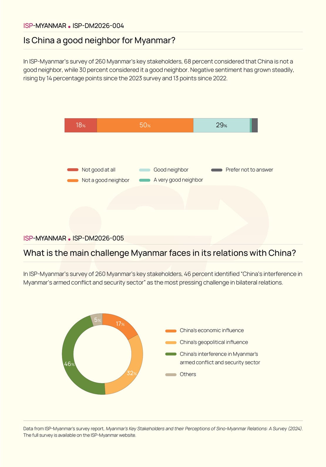 However, negative perceptions of China have significantly increased among Myanmar’s political, military, economic, and social key stakeholders. The 2024 findings of ISP-Myanmar’s annual survey, Myanmar’s Key Stakeholders and their Perceptions of Sino-Myanmar Relations, reveal a marked rise in respondents who view China as “not a good neighbor.” Notably, the majority of respondents identified China’s interference in Myanmar’s internal armed conflicts and security sector as the greatest challenge in bilateral relations—a shift from previous years, where economic dominance was cited as the primary concern.