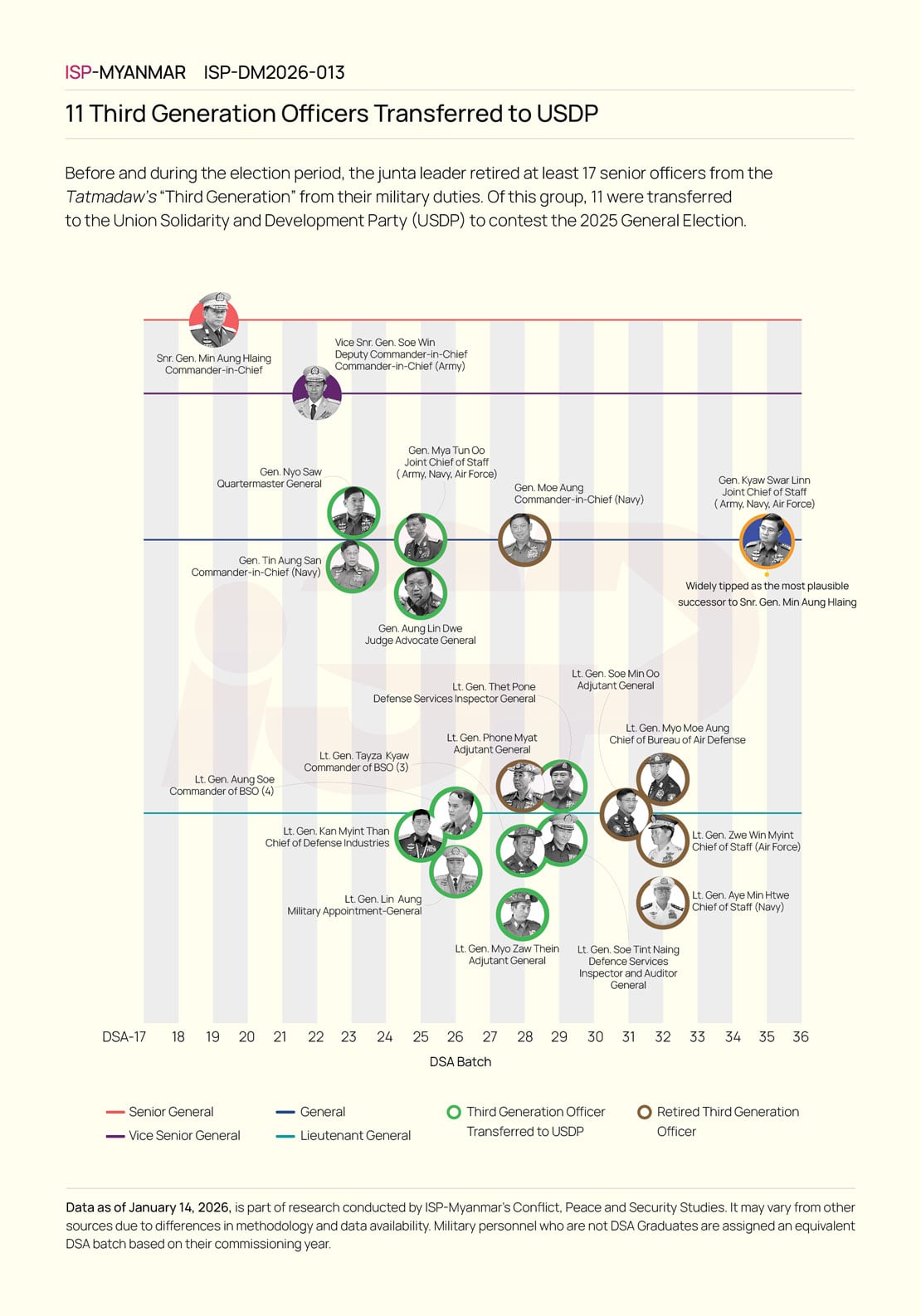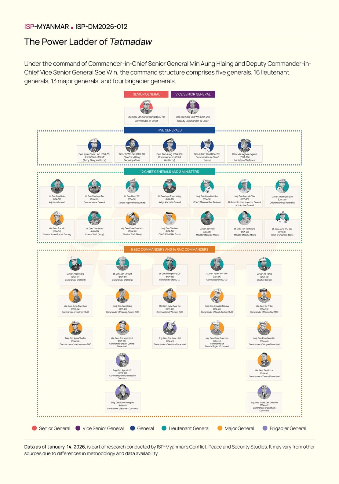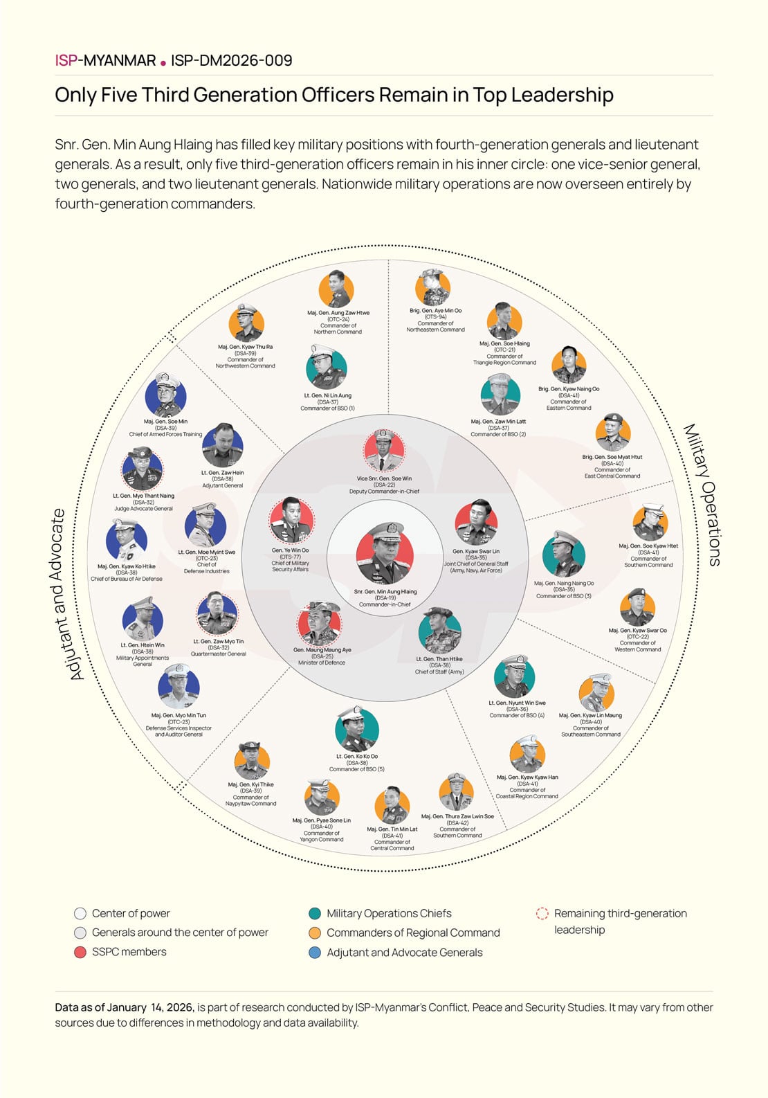 In the post-election period, whether Snr. Gen. Min Aung Hlaing takes the presidency himself or governs through a puppet president, a return to anything like the 2010 Thein Sein interlude looks fanciful. A closer parallel may be the decade after independence (1948–58), remembered in the Tatmadaw’s own historiography as an era of “crushing internal insurgency”. In that setting, the steady ascent of fourth-generation leaders within the Tatmadaw becomes a central variable—and one that deserves close attention [see ISP Data Matters (ISP-DM2026-009 to 013)].