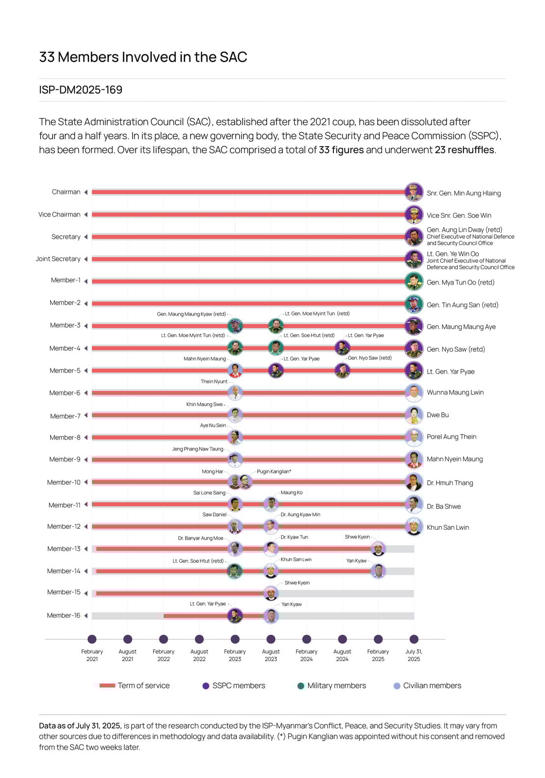 The State Administration Council (SAC), formed by junta leader Snr. Gen. Min Aung Hlaing, a day after the coup, was disbanded on July 31, 2025, after four and a half years in power. It was replaced by the State Security and Peace Commission (SSPC), composed of both in-service and retired generals.